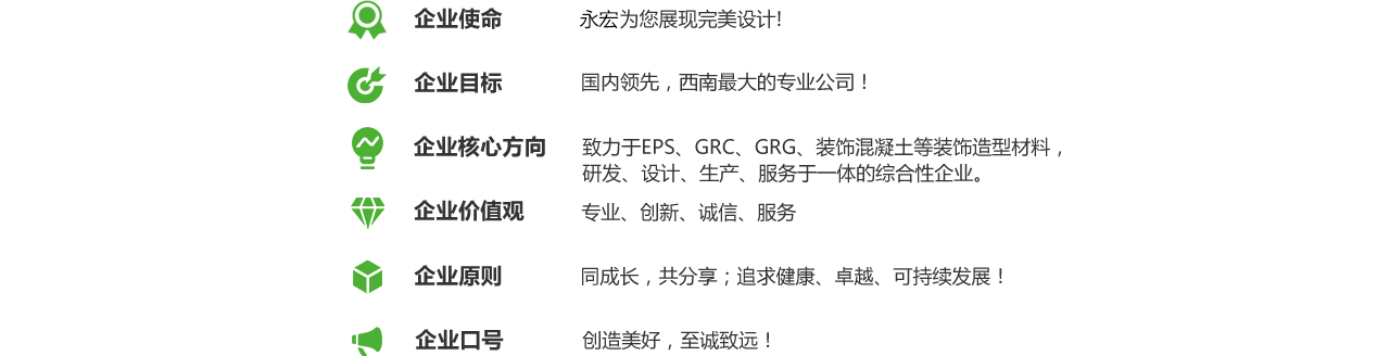 貴州永宏優(yōu)創(chuàng)新型材料有限公司的前身成立于2006年,公司從事外墻建筑材料如grc線條、grc圓柱、grc圓弧、grc羅馬柱、grc圓柱腳 、grc梁托、grc窗套、grc門套、grc腰線、grc浮雕、grc檐角線、grc檐角線、grc庭柱等構件的設計、研發(fā)、生產(chǎn)和服務的綜合性企業(yè)。生產(chǎn)基地位于都江堰崇義鎮(zhèn),占地面積一萬多平方米,擁有國內(nèi)grc線條生產(chǎn)設備。經(jīng)過16年的發(fā)展,